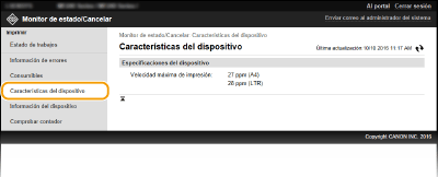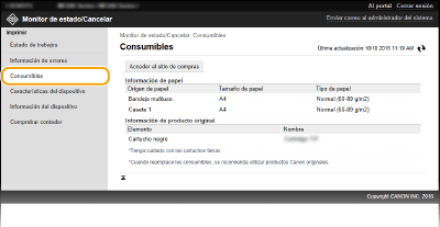 Se mostrará información sobre el tamaño y el tipo de papel para el origen del papel, el número de modelo del cartucho de tóner, etc. También podrá hacer clic en [Comprobar detalles de consumibles] en