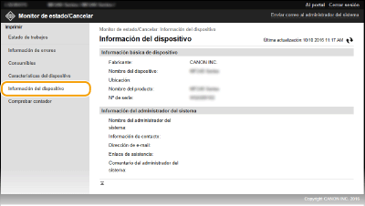 Se muestra la información sobre el equipo y el administrador del sistema. Esta información está establecida en [Gestión del sistema] en la página [Configuración].