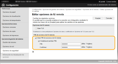 Marque la casilla de verificación [Usar PIN de acceso a la IU remota] y establezca el PIN.