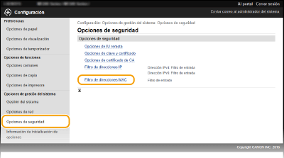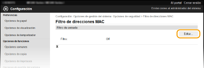 ![]() Comprobación de los errores de entrada Si las direcciones MAC se introducen de forma incorrecta, es posible que no pueda acceder al equipo desde la IU remota, en cuyo caso deberá establecer <Filtro de direcciones MAC> en <Off>. Filtro de direcciones MAC
