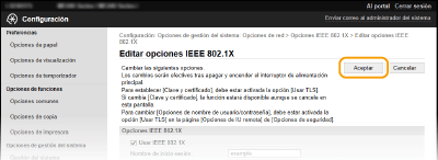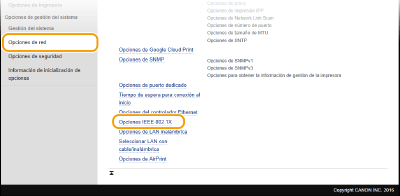 Uso del panel de controlTambién podrá activar o desactivar la autenticación IEEE 802.1X desde <Menú>. Opciones IEEE 802.1X
