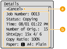 The number of copies, settings, and other details are displayed. If you only want to check the details without canceling copying, press  to return to the copy main screen.