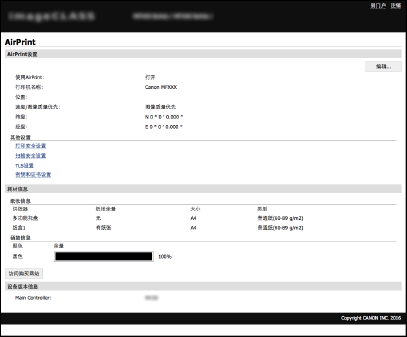 可以显示 AirPrint 画面,通过此画面,不仅可以访问 AirPrint 设置,而且可以查看纸张和墨粉盒等耗材信息。另外还可以配置安全功能设置(