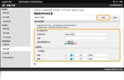 可以注册用来识别本机的信息,包括本机名称和安装位置。也可以禁用本机的 AirPrint 功能。使用远程用户界面改变这些设置。
