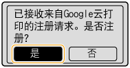 从移动设备或 Google Chrome 注册也可以从移动设备或 Google Chrome* 注册本机。本机的显示屏将在注册完成前显示以下确认画面。选择 <是> 完成注册。 * 有关注册步骤,请参阅移动设备使用说明书或Google云打印网站。 |