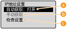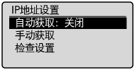 手动输入 IP 地址1 | 确认 <自动获取> 设置为 <关闭>。 ![]() 如果显示 <打开>,请选择 <自动获取>,然后将 <选择通信协议> 和 <自动获取IP> 均设置为 <关闭>。 |