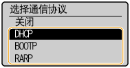 2 | 选择 <DHCP>、<BOOTP> 或 <RARP>,然后按 。![]() ![]() 如果不想使用 DHCP/BOOTP/RARP 分配 IP 地址 选择 <关闭>。如果选择 <DHCP>、<BOOTP> 或 <RARP>,而这些服务不可用时,本机将浪费时间和通信资源来搜索这些服务的网络。 |