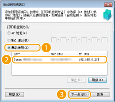 3 | 单击 [自动检测],当检测到本机时选择本机,然后单击 [下一步]。  如果未检测到本机单击 [刷新]。如果问题仍然存在,请单击 [IP 地址] 或 [MAC 地址],输入本机的 IP 地址或 MAC 地址 ( 查看网络设置),然后单击 [下一步]。 |