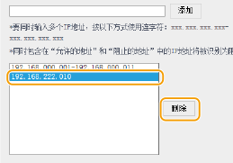 2 | 指定地址。 在 [要注册的地址] 文本框中输入 IP 地址(或 IP 地址范围),然后单击 [添加]。 已注册地址 | 结果 | [阻止的地址] | 限制与输入了 [要注册的地址] IP 地址的设备通信(接收)。允许与具有任何其他 IP 地址的设备通信。 | [允许的地址] | 仅允许与输入了 [要注册的地址] IP 地址的设备通信(接收)并限制与具有任何其他 IP 地址的设备通信。 | 已注册为两者 | 仅允许与将 IP 地址注册到了 [允许的地址] 中的设备通信(接收)并限制与具有任何其他 IP 地址的设备通信。但是,对于同样注册到了 [阻止的地址] 中的 IP 地址,通信也会受限。 |