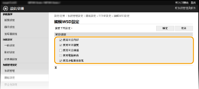 勾選此核取方塊,即可透過 WSD 列印。若不使用 WSD 列印,清除此核取方塊。 [使用WSD瀏覽]