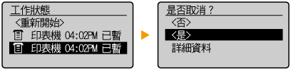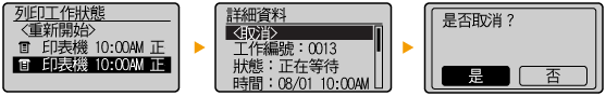 從遠端使用者介面取消可以從遠端使用者介面的 [工作狀態] 頁面取消列印:檢查列印文件的目前狀態