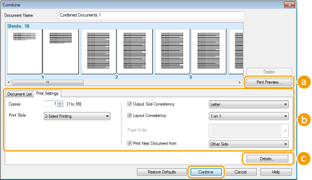 On the [Document Name] list, select the combined-document print job you want to print, and click