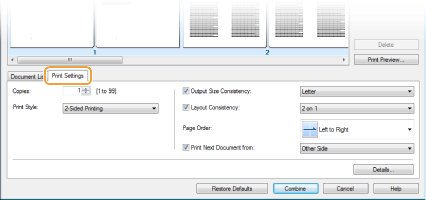 Click the [Print Settings] tab to display the screen for specifying print settings such as the number of copies or 1-sided/2-sided printing. The settings specified here are applied to the whole print job.