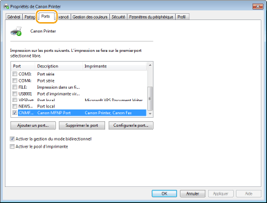 Si vous utilisez une connexion réseau et que vous ayez modifié l'adresse IP de l'appareilSi [Description] pour le port sélectionné est [Canon MFNP Port] et que l'appareil et l'ordinateur appartiennent au même sous-réseau, la connexion est maintenue. Vous n'avez pas besoin d'ajouter un nouveau port. En revanche, si la description indique [Standard TCP/IP Port], alors vous devez ajouter un nouveau port. Configuration des ports d'imprimante