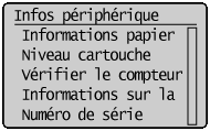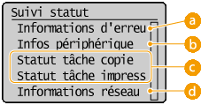 Affiche l'état de l'appareil, tel que le format du papier ou d'encre encore disponible dans les cartouches de toner.