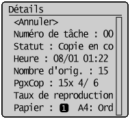 Affiche le statut actuel de l'élément sélectionné. L'écran <Statut tâche copie> est illustré à titre d'exemple ci-dessous.