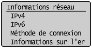 Affiche les réglages réseau tels que l'adresse IP de l'appareil et l'état (condition des communications réseau local sans fil, par exemple).