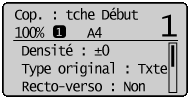 (COPY/SCAN), l'écran principal de la fonction sélectionnée s'affiche. L'écran principal du mode de copie est illustré pour exemple ci-après.