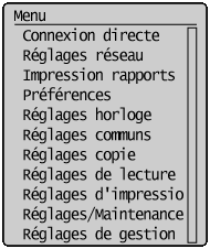 , l'écran <Menu> s'affiche. Sur cet écran, vous commencez à définir les réglages généraux de l'appareil tels que <Préférences> ou <Réglages horloge>, ainsi qu'un grand nombre de réglages propres à chaque fonction (copie, numérisation...).