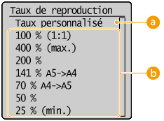 Vous agrandissez ou réduisez les copies en appliquant un taux de reproduction prédéfini, <A5->A4> par exemple, ou en définissent un taux de reproduction personnalisé par incréments de 1 %.