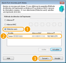 ![]() ![]() Si l'appareil n'est pas détecté Cliquez sur [Actualiser]. Si le problème persiste, cliquez sur [Adresse IP] ou [Adresse MAC], saisissez l'adresse IP ou MAC de l'appareil (Affichage des réglages réseau), puis cliquez sur [Suivant].