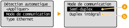 sélectionnez <Semi-duplex> ou <Duplex intégral> .![]() <Semi-duplex>Reçoit et envoie les données de communication en alternance. Sélectionnez cette option si l'appareil est relié à un périphérique de réseau en semi-duplex.