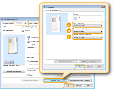 Sélectionnez la position d'impression de la date d'impression, du nom d'utilisateur ou des numéros de pages