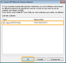 Assurez-vous que l'appareil et l'ordinateur sont correctement reliés et que le logiciel est installé. Pour obtenir des informations sur la façon de procéder à cette vérification, reportez-vous à "Guide d'installation du pilote MF". Pour établir la connexion via un réseau local filaire ou sans fil, vous devez enregistrer l'appareil dans MF Network Scanner Selector. Conformez-vous à la procédure suivante. Celle-ci est inutile si l'appareil et l'ordinateur utilisé sont reliés par un câble USB.