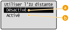 L'interface utilisateur distante est particulièrement pratique dans la mesure où elle permet de spécifier les réglages de l'appareil à partir d'un navigateur Web sur un ordinateur. Pour tirer parti de l'interface utilisateur distante, il est nécessaire de connecter l'appareil à un ordinateur via le réseau. Si vous n'avez pas besoin de faire appel à l'interface utilisateur distante, vous pouvez la désactiver pour éviter qu'une tierce partie mal intentionnée prenne le contrôle à distance de votre appareil via le réseau.