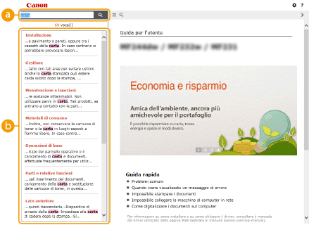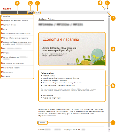 La Guida per l'utente è suddivisa in diverse schermate e il contenuto di ciascuna schermata varia.
