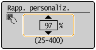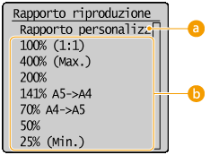 È possibile ingrandire o ridurre le copie utilizzando un rapporto di riproduzione predefinito come <A5->A4> o impostando un rapporto di riproduzione personalizzato con incrementi dell'1%.