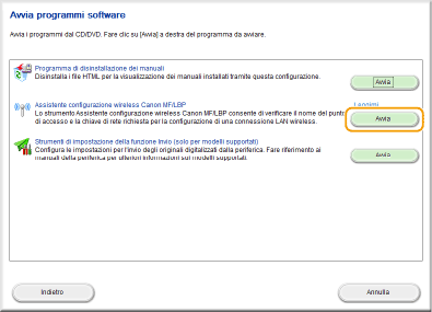 Fare clic su [Avvia] per [Assistente configurazione wireless Canon MF/LBP].