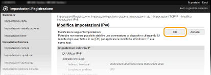 Utilizzo del pannello operativoÈ anche possibile accedere alle impostazioni IPv6 dalla schermata <Menu>. Impostazioni IPv6