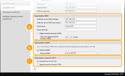 Selezionare la casella di controllo per aggiornare dinamicamente i record DNS qualora cambi l'indirizzo IP della macchina. Quando si specifica l'intervallo tra gli aggiornamenti, specificare il tempo in ore nella casella di testo [Intervallo aggiornamento dinamico DNS]. [Impostazioni mDNS][Utilizzo mDNS]