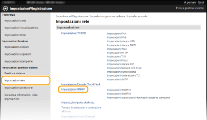 È inoltre possibile specificare le impostazioni SNMPv1 e abilitare/disabilitare le impostazioni SNMPv3 dalla schermata <Menu>. Impostazioni SNMP