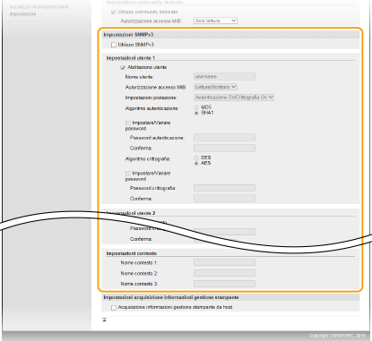 Se entrambe le versioni di SNMP sono abilitate, si consiglia di impostare le autorizzazioni di accesso MIB in SNMPv1 su [Solo lettura]. Le autorizzazioni di accesso MIB possono essere impostate indipendentemente in SNMPv1 e SNMPv3 (e per ogni ciascun utente in SNMPv3). Selezionando [Lettura/Scrittura] (autorizzazione di accesso completa) in SNMPv1 si annullano le solide caratteristiche di sicurezza che contraddistinguono SNMPv3 poiché la maggior parte delle impostazioni della macchina possono quindi essere controllate con SNMPv1.
