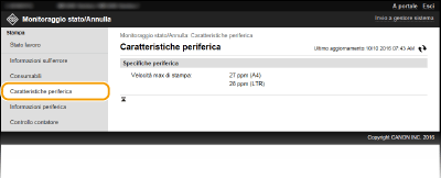 Vengono visualizzati il formato e il tipo di carta per l'origine carta, il numero del modello della cartuccia del toner e altre informazioni. È possibile anche fare clic su [Verifica dettagli consumabili] in