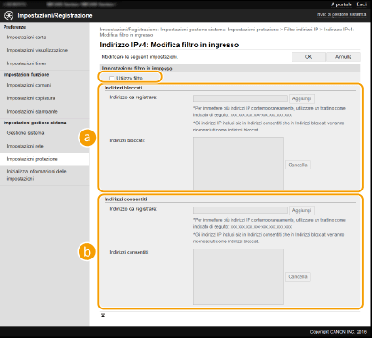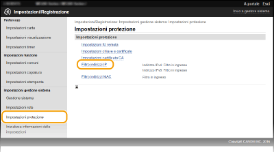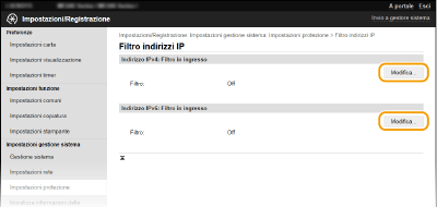 Se gli indirizzi IP sono immessi in modo non corretto, potrebbe non essere possibile accedere alla macchina dalla IU remota, in questo caso è necessario impostare <Filtro indirizzi IPv4> o <Filtro indirizzi IPv6> su <Off>. Filtro indirizzi IPv4 Filtro indirizzi IPv6