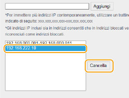 Eliminazione di un indirizzo IP dalle eccezioni Selezionare un indirizzo IP e fare clic su [Cancella].