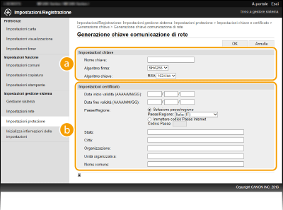Quando è richiesta per la comunicazione tramite Transport Layer Security (TLS), è possibile generare una coppia di chiavi con la macchina. È possibile utilizzare TLS quando si accede alla macchina tramite la IU remota. Possono essere generare fino a cinque coppie di chiavi nella macchina (comprese le coppie preinstallate). I certificati autofirmati sono utilizzati con le coppie di chiavi generate in "Comunicazione di rete". Tramite una "Chiave e richiesta firma certificato (CSR)", è possibile richiedere un certificato digitale emesso da CA per la coppia di chiave generate dalla macchina.