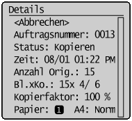 Zeigt den aktuellen Status des ausgewählten Auftrags an. Im Folgenden sehen Sie als Beispiel den Bildschirm <Status Kopierauftrag>.