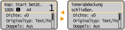 Meldungen werden oben im Bildschirm angezeigt, wenn beispielsweise eine Tonerpatrone das Ende ihrer Nutzungsdauer erreicht hat oder eine Abdeckung noch geöffnet ist. Im Display werden abwechselnd der normale Bildschirm und die Meldung angezeigt.