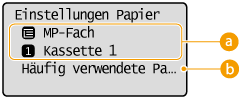 (Papiereinstellungen) drücken, um das Papier zum Kopieren oder Drucken auszuwählen, wird der Bildschirm <Einstellungen Papier> angezeigt. Wählen Sie das Papier im Bildschirm aus. Sie können diese Taste auch zum Ändern der Papiereinstellungen drücken, wenn Sie Papier in einem anderen Format als das zuvor eingelegte Papier einlegen. Beachten Sie, dass die Papierangaben stimmen müssen, damit das Papier ordnungsgemäß zugeführt werden kann.