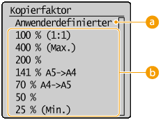 Sie können zum Vergrößern oder Verkleinern von Kopien einen voreingestellten Kopierfaktor wie <A5->A4> auswählen oder in Schritten von 1 % einen anwenderdefinierten Kopierfaktor einstellen.