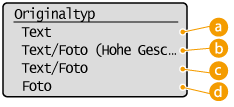 Sie können die optische Bildqualität für die Kopie abhängig vom Dokumententyp auswählen, wie zum Beispiel Nur-Text-Dokumente, Dokumente mit Diagrammen und Grafiken oder Zeitschriftenfotos.