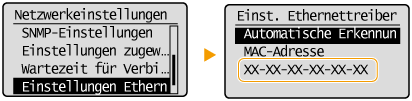 Wenn Sie das Gerät an einen Switching-Hub oder eine Bridge anschließen, kann es auch bei einer korrekt konfigurierten IP-Adresse zu einem Kommunikationsfehler kommen. Dieses Problem können Sie lösen, indem Sie ein Intervall einstellen und so den Start der Kommunikation verzögern. Einstellen einer Wartezeit für die Netzwerkverbindung