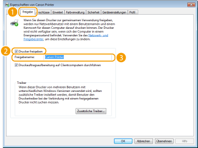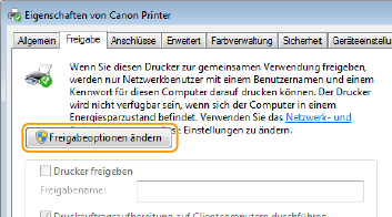 Klicken Sie auf die Registerkarte [Freigabe], wählen Sie [Drucker freigeben], und geben Sie den Freigabenamen des Geräts ein.