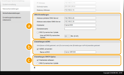 Das von Bonjour implementierte mDNS (Multicast-DNS) ist ein Protokoll zur Zuordnung von Hostnamen zu IP-Adressen ohne DNS. Aktivieren Sie das Kontrollkästchen, um mDNS zu aktivieren, und geben Sie den mDNS-Namen in das Textfeld [Name mDNS] ein. [Einstellungen DHCP-Option][Hostnamen erfassen]
