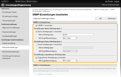 Sie können auch über den Bildschirm <Menü> SNMPv1-Einstellungen angeben und SNMPv3-Einstellungen aktivieren oder deaktivieren. SNMP-Einstellungen