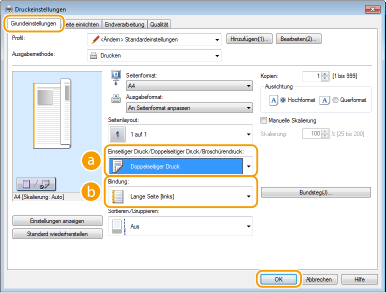 Wählen Sie [Einseitendruck] oder [Doppelseitiger Druck] in [Einseitiger Druck/Doppelseitiger Druck/Broschürendruck]